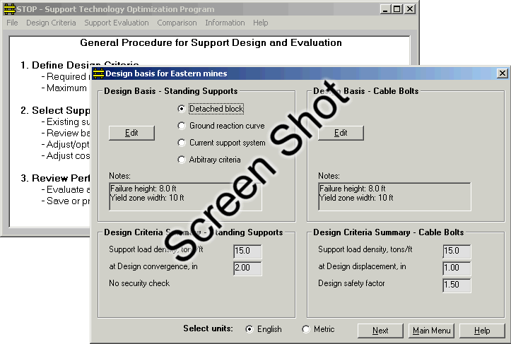 Support Technology Optimization Program screen shotThe software includes a complete database of the support characteristics and loading profiles obtained through safety performance testing of these supports at the NIOSH Safety Structures Testing Laboratory.