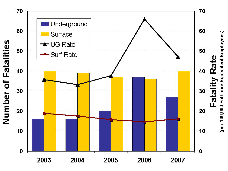 In 2007, there were 67 occupational mining fatalities, compared to 73 in 2006.  The overall fatality rate was 21.9 per 100,000 FTE workers.