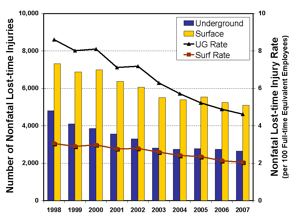 Within underground work locations, 2,645 nonfatal lost-time injuries were reported, resulting in 170,584 lost workdays. [6] This compares to 5,097 nonfatal lost-time injuries attributed to surface workers (total days lost = 255,635).