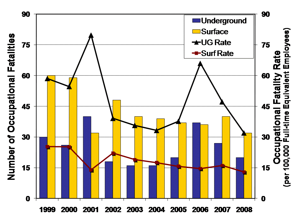 In 2008, there were 52 occupational mining fatalities with a rate of 16.8 [95% confidence interval (CI): 12.5, 22.0] per 100,000 FTE workers.