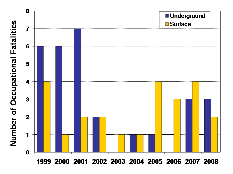 Five occupational fatalities occurred among metal mine operator employees in 2008, compared to seven fatalities in 2007