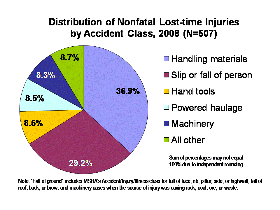 - In 2008, the most frequent classification of nonfatal lost-time injuries involved handling materials (n=187; 36.9%), followed by slip or fall of person (n=148; 29.2%).