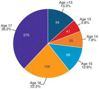Number and distribution of fatal occupational injuries by age among young workers, 1992-2002. Fatal occupational injuries among workers aged 16 and 17 accounted for 158 and 270 fatalities, respectively, or 60.5% of all fatal occupational injuries among workers aged 17 and younger for the period 1992-2002. A significant number of deaths (94 or 13.3% of the total) occurred among youths less than 13 years of age (Source: BLS [2003d]. in NIOSH Worker Health Chartbook, 2004, Fig 5-6 ).