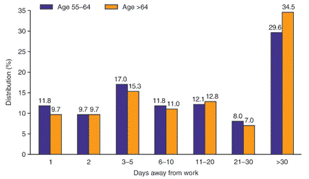 Distribution of nonfatal occupational injuries and illnesses involving days away from work among workers aged 55 and older in private industry by days away from work, 2001. Workers aged 65 and older tended to experience lower percentages of short-term work loss (1 and 3–5 days) and a substantially higher percentage of long-term work losses of 31 days or more (29.6% for workers aged 55–64, and 34.5% for those aged 65 and older). Workers aged 55–64 had a median loss of 10 days away from work, and those aged 65 and older had a median of 14 days. Overall, private sector workers had a median of 6 days away from work (Source: BLS [2003b,c]. in NIOSH Worker Health Chartbook, 2004, Fig 5-29 ).