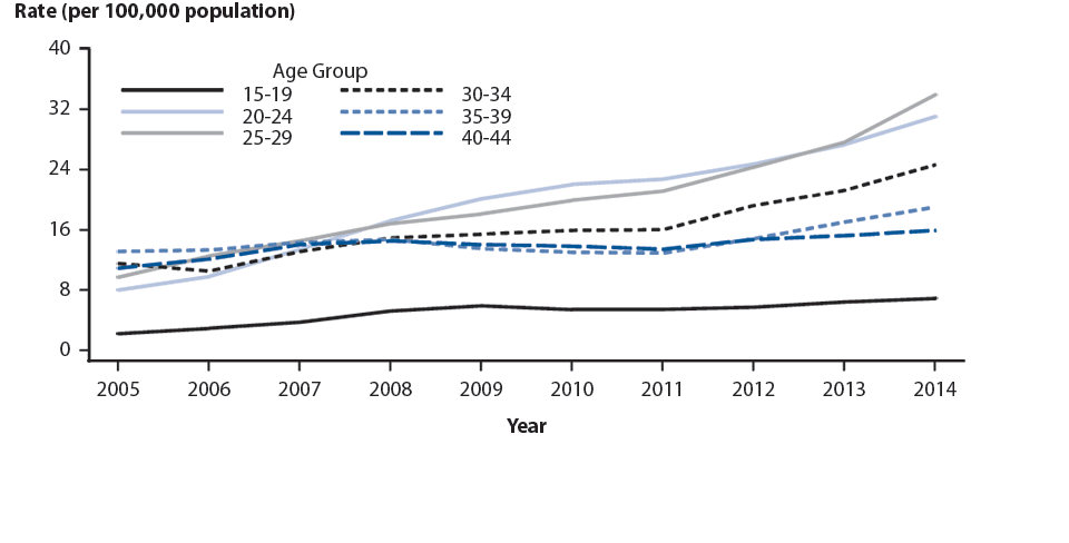 Figure 39. Primary and Secondary Syphilis — Rates of Reported Cases Among Men Aged 15–44 Years by Age, United States, 2005–2014