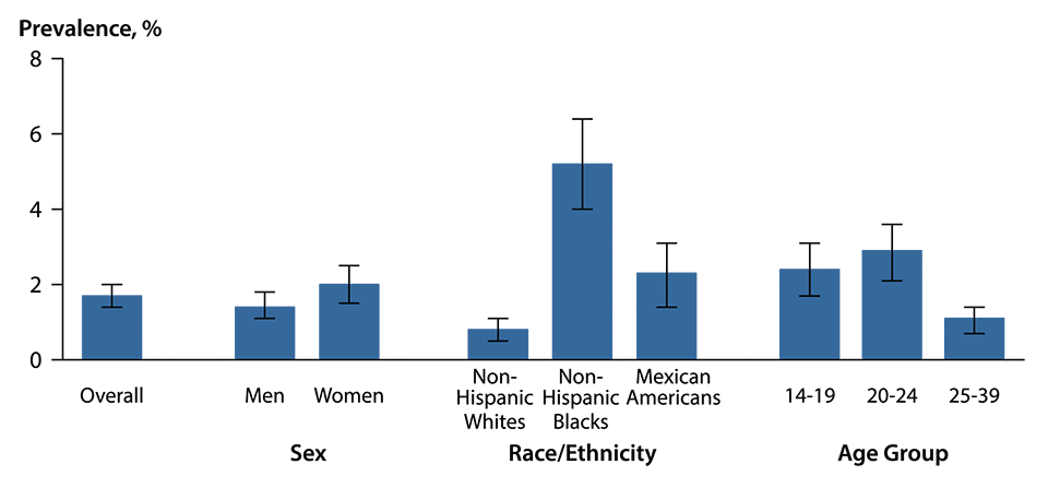 SOURCE: Torrone E, Papp J, Weinstock H; Centers for Disease Control and Prevention (CDC). Prevalence of Chlamydia trachomatis genital infection among persons aged 14–39 — United States, 2007–2012. MMWR Morb Mortal Wkly Rep. 2014 Sep 26;63(38):834–8.