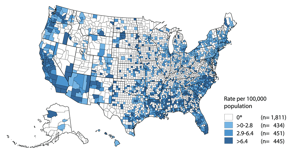 * In 2015, 1,811 (57.7%) of 3,141 counties in the United States reported no cases of primary and secondary syphilis. Refer to the NCHHSTP Atlas for further county-level rate information: https://www.cdc.gov/nchhstp/atlas/.