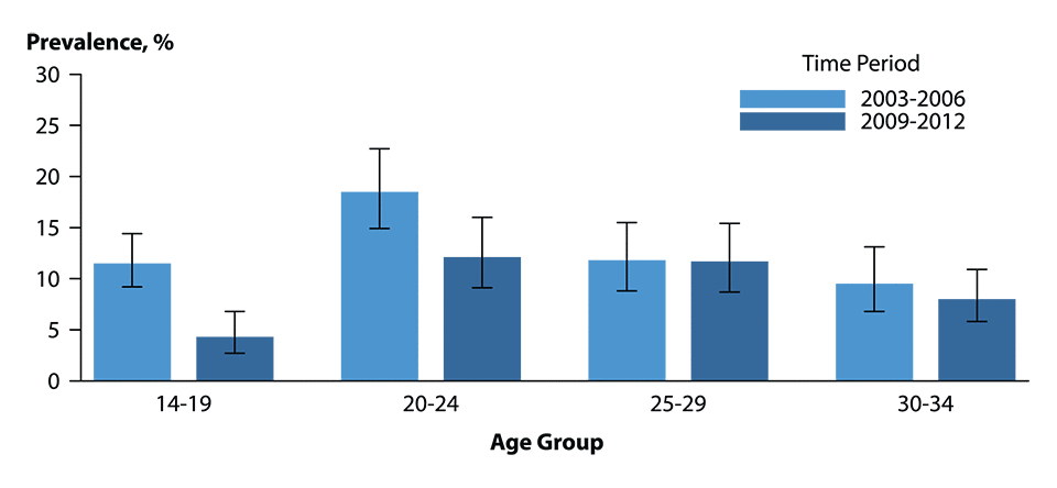 Figure 46. Human Papillomavirus — Cervicovaginal Prevalence of Types 6, 11, 16 and 18 Among Women Aged 14–34 Years by Age Group and Time Period, National Health and Nutrition Examination Survey, 2003–2006 and 2009–2012