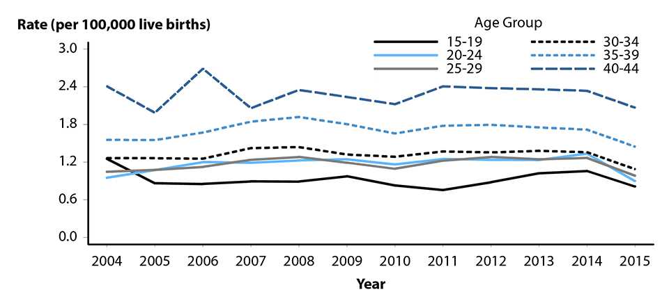 Figure C. Ectopic Pregnancy — Rates Among Commercially Insured Women with Live Births Aged 15–44 Years by Age Group, 2004–2015