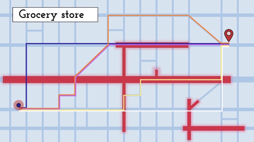 When we type a destination, the app uses an algorithm to look at the various available routes. Next, it uses a different algorithm to check the current traffic, then a third one takes that information and calculates the best available route.