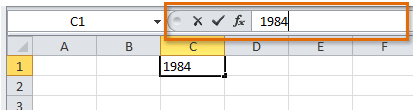 In the formula bar, you can enter or edit data, a formula, or a function that will appear in a specific cell. In this image, cell C1 is selected and 1984 is entered into the formula bar. Note how the data appears in both the formula bar and in cell C1.