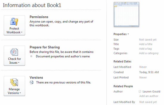 Info contains information about the current workbook. You can also inspect and edit its permissions.