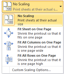Choose how to scale your worksheets for the printed page. You can scale worksheets at their actual size, to fit all on one page, to fit all the columns on one page, or to fit all the rows on one page.