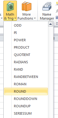 The Math & Trig category includes functions for numerical arguments. For example, you can round values (ROUND), find the value of Pi (PI), multiply (PRODUCT), and subtotal (SUBTOTAL).