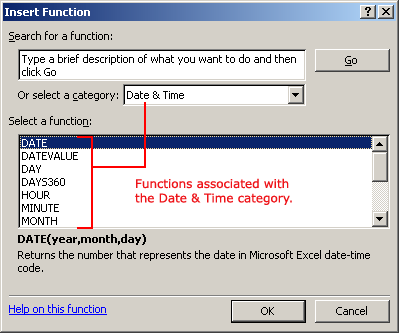 You can type a question in the Search for a function box and click GO, scroll through the alphabetical list of functions in the Select a function field, or select a function category in the Select a category drop-down list and review the corresponding function names in the Select a function field.