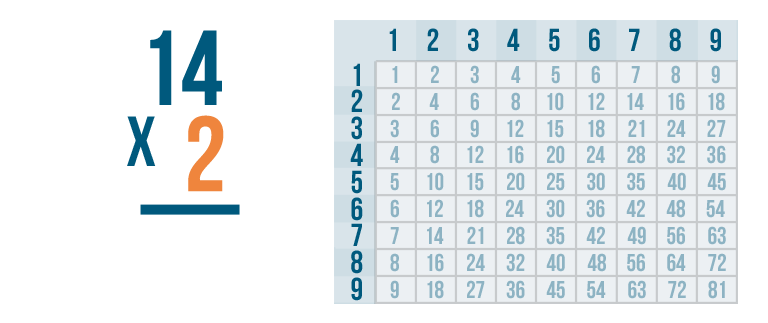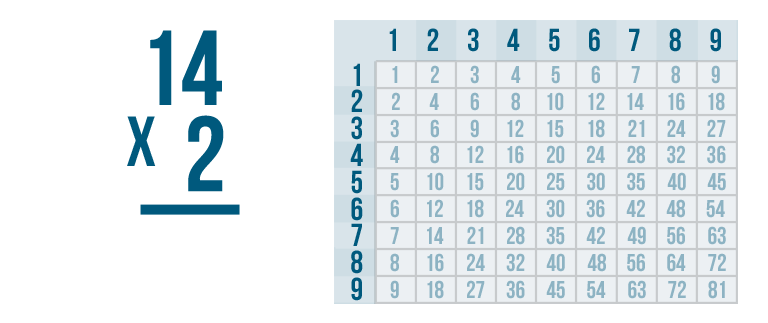 We'll multiply 2 by the top number, 14. Since there's no 14 in the times table, we'll have to multiply one digit at a time.