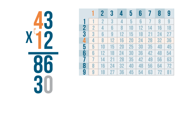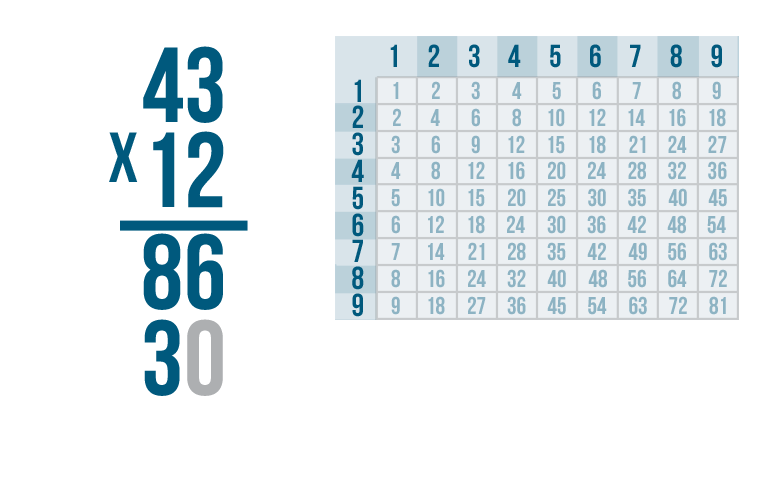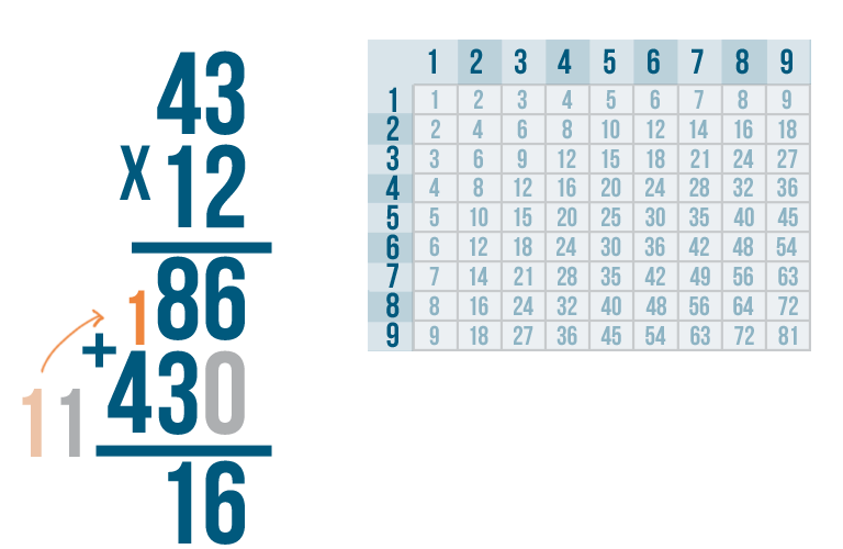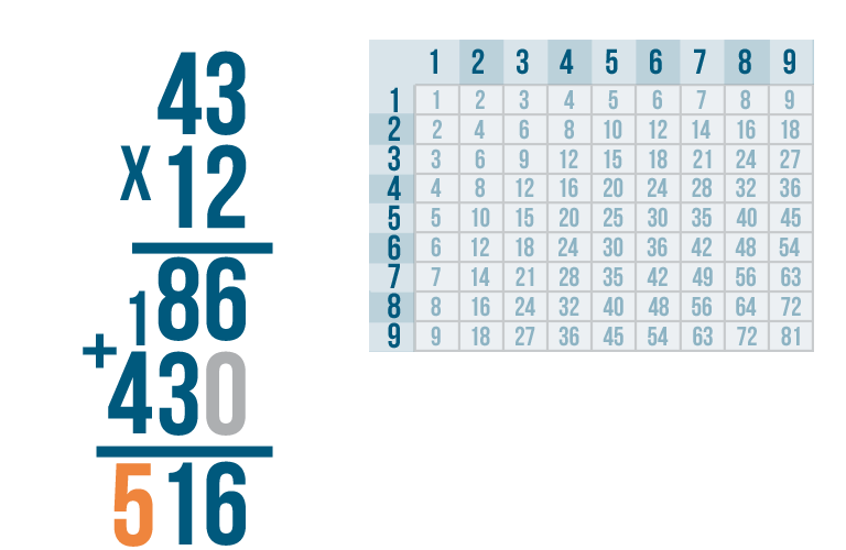 We're done! Our total is 516. In other words, 43 x 12 = 516.