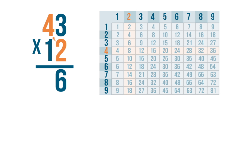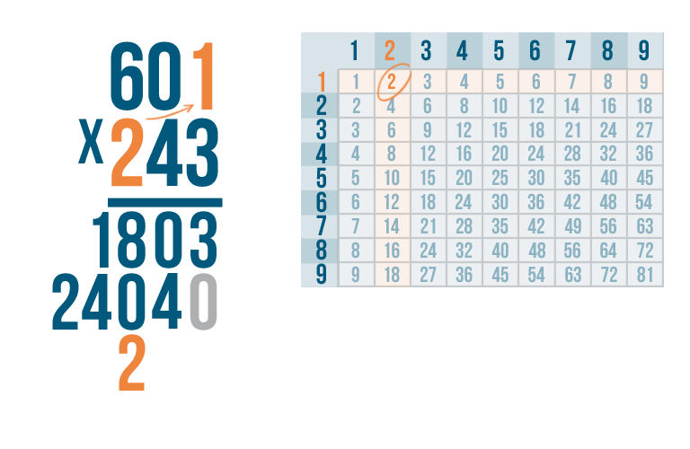 When you multiply stacked numbers, you start with the right digit in the bottom number of the problem. Our bottom number only has one digit: 2.