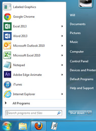 Click the Start button to access the Start menu, which lets you access applications, files and settings. You can also use the Start menu to shut down your computer.