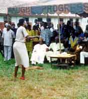 | In Nigeria, a woman speaks to an audience about HIV/AIDS.