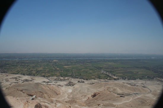 View from the high peak of the Theban hills showing the sharp delineation between the lush Valley and the barren desert. Photo: Dr Amy Calvert