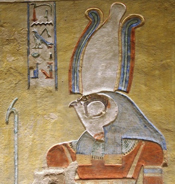 Horus is regularly shown guarding and guiding the living ruler; as in this image of a falcon (Horus) wrapped behind the head of Ramses III in the tomb of Khaemwaset. Photo: Dr Amy Calvert