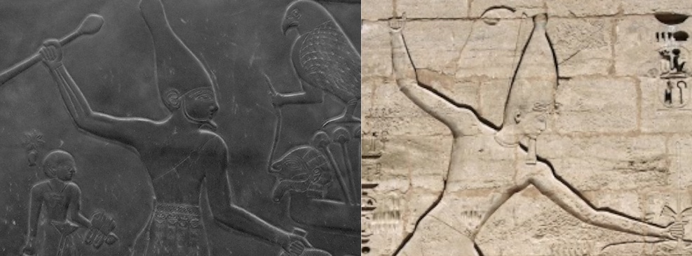 'Palette of Narmer', c. 3000-2920 B.C.E. (left) and 'Ramses III smiting at Medinet Habu' (1160 B.C.E.) (right)