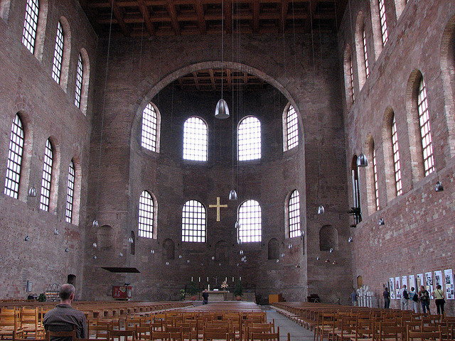 Basilicas also served as audience halls as a part of imperial palaces. A well-preserved example is found in the northern German town of Trier. Constantine built a basilica as part of a palace complex in Trier which served as his northern capital. Although a fairly simple architectural form and now stripped of its original interior decoration, the basilica must have been an imposing stage for the emperor. Imagine the emperor dressed in imperial regalia marching up the central axis as he makes his dramatic adventus or entrance along with other members of his court. This space would have humbled an emissary who approached the enthroned emperor seated in the apse.