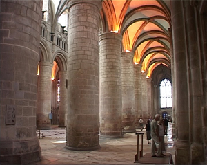 The arches that define the naves of these churches are well modulated and geometrically logical – with one look you can see the repeating shapes, and proportions that make sense for an immense and weighty structure. There is a large arcade on the ground level made up of bulky piers or columns. The piers may have been filled with rubble rather than being solid, carved stone. Above this arcade is a second level of smaller arches, often in pairs with a column between the two. The next higher level was again proportionately smaller, creating a rational diminution of structural elements as the mass of the building is reduced.
