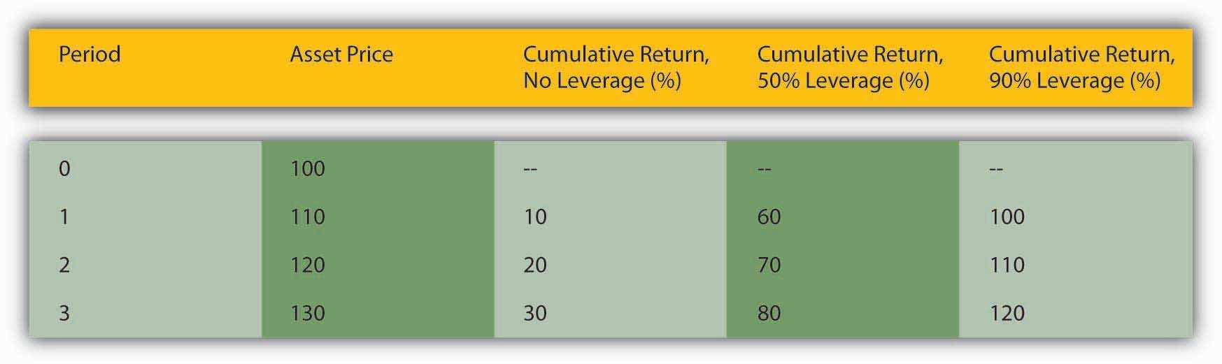 To increase their returns, investors often employ leverage, or borrowing. Compare three investors, one who buys asset X entirely with his own money, one who borrows half of the price of asset X, and one who borrows 90 percent of the price of asset X. Their returns (not including the cost of borrowing, which as noted above is usually low during bubbles) will be equal to those calculated in Figure 12.1 "The effects of leverage on returns in a rising market".