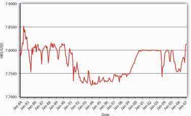 It appears highly likely from Figure 19.8 "Hong Kong–USD exchange rate, 1984–2007" that Hong Kong’s monetary authority for most of the period from 1984 to 2007 engaged in a managed float within fairly tight bands bounded by about HK7.725 and HK7.80 to the dollar. Also, for three years early in the new millennium, it pegged the dollar at HK7.80 before returning to a looser but still tight band in 2004.