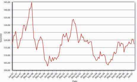 Figure 19.7 "Dollar-yen exchange rate, 1997–2007" certainly is not a fixed exchange rate regime, or a managed float with a tight band. It could be consistent with a fully free float, but it might also represent a managed float with wide bands between about ¥100 to ¥145 per dollar.