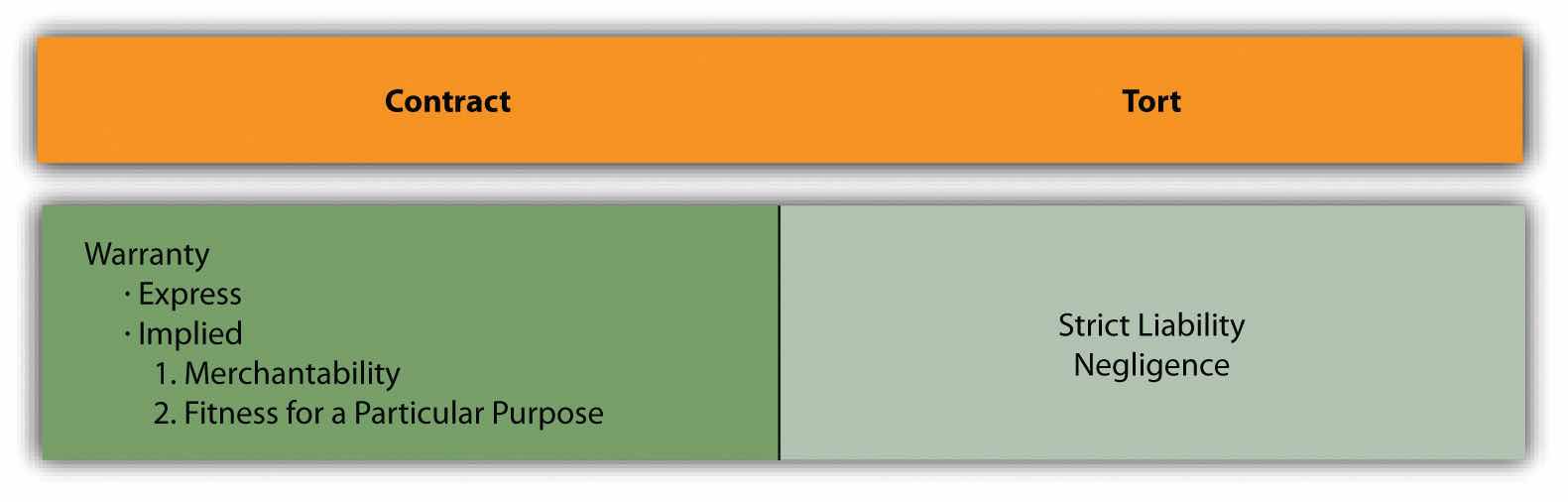 In the typical products-liability case, three legal theories are asserted—a contract theory and two tort theories. The contract theory is warrantyA guarantee., governed by the UCC, and the two tort theories are negligenceThe legal theory imposing liability on a person for the proximate consequences of her carelessness. and strict products liabilityLiability imposed on a merchant-seller of defective goods without fault., governed by the common law. See Figure 11.1 "Major Products Liability Theories".