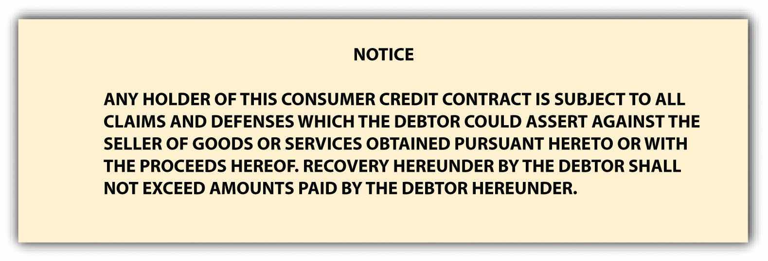 Acting to curb abuses, the Federal Trade Commission (FTC) in 1976 promulgated a trade regulation rule that in effect abolished the holder-in-due-course rule for consumer credit transactions. Under the FTC rule titled “Preservation of Consumers’ Claims and Defenses,”16 Code of Federal Regulations, Section 433. the creditor becomes a mere holder and stands in the shoes of the seller, subject to all claims and defenses that the debtor could assert against the seller. Specifically, the rule requires the seller to provide notice in any consumer credit contract that the debtor is entitled to raise defenses against any subsequent purchaser of the paper. It also bars the seller from accepting any outside financing unless the loan contract between the consumer and the outside finance company contains a similar notice. (The required notice, to be printed in no less than ten-point, boldface type, is set out in Figure 15.3 "Notice of Defense".) The effect of the rule is to ensure that a consumer’s claim against the seller will not be defeated by a transfer of the paper. The FTC rule has this effect because the paragraph to be inserted in the consumer credit contract gives the holder notice sufficient to prevent him from becoming an HDC.