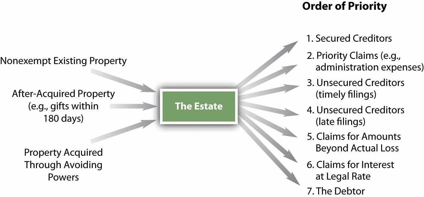 The estate includes all his or her assets or all their assets (in the case of a married couple) broadly defined. From the estate, the debtor removes property claimed exempt; the trustee may recapture some assets improperly removed from the estate (preferential and fraudulent transfers), and what’s left is the distributable estate. It is important to note that the vast majority of Chapter 7 bankruptcies are no-asset casesA bankruptcy case with no nonexempt property.—90–95 percent of them, according to one longtime bankruptcy trustee.Eugene Crane, Hearing before the Subcommittee on Commercial and Administrative Law of the Committee on the Judiciary, House of Representatives, One Hundred Tenth Congress, Second Session, Statement to the House Judiciary Sub-Committee, September 16, 2008; http://judiciary.house.gov/hearings/printers/110th/44493.PDF. That means creditors get nothing. But in those cases where there are assets, the trustee must distribute the estate to the remaining classes of claimants in this order: