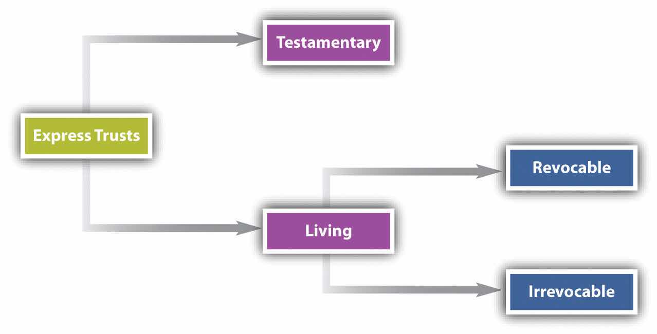 Trusts are divided into two main categories: express and implied. Express trusts include testamentary trustsA trust made during the settlor’s life that takes effect on his death. and inter vivos (or living) trustsA trust that takes effect during the life of the settlor.. The testamentary trust is one created by will. It becomes effective on the testator’s death. The inter vivos trust is one created during the lifetime of the grantor. It can be revocable or irrevocable (see Figure 27.3 "Express Trusts").
