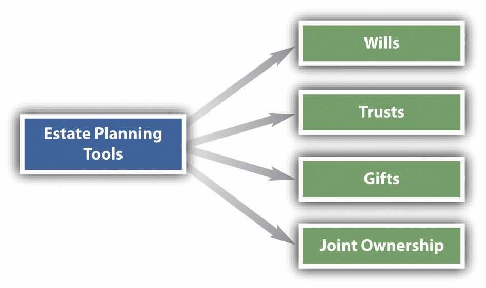 People have at their disposal four basic estate planning tools: (1) wills, (2) trusts, (3) gifts, and (4) joint ownership (see Figure 27.1 "Estate Planning"). The rules governing gifts are discussed in Chapter 22 "Introduction to Property: Personal Property and Fixtures", and joint ownership is treated in Chapter 24 "The Nature and Regulation of Real Estate and the Environment". Consequently, we focus on the first two tools here. In addition to these tools, certain assets, such as insurance (discussed in Chapter 28 "Insurance"), are useful in estate planning.