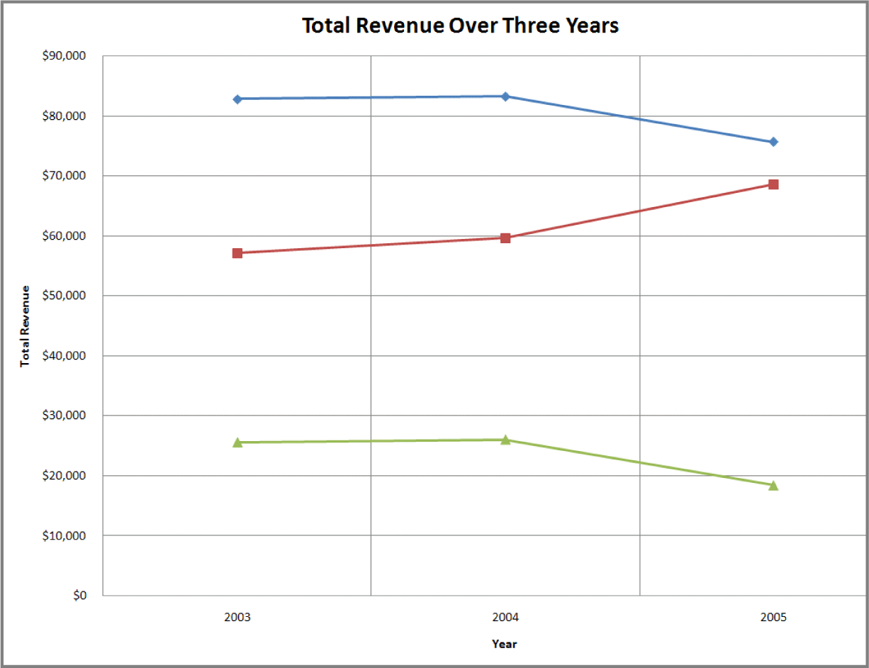 Notice the graphs on the following page. The “after” graph has six design improvements over the first. They deal specifically with formatting the graph to maximize information transfer to the reader. Most of the graph design guidelines come from Edward Tufte’s principles of analytical design. These principles require refining the graph after Excel has applied its default settings. The exercises in this chapter provide instructions on how to carry out these refinements.