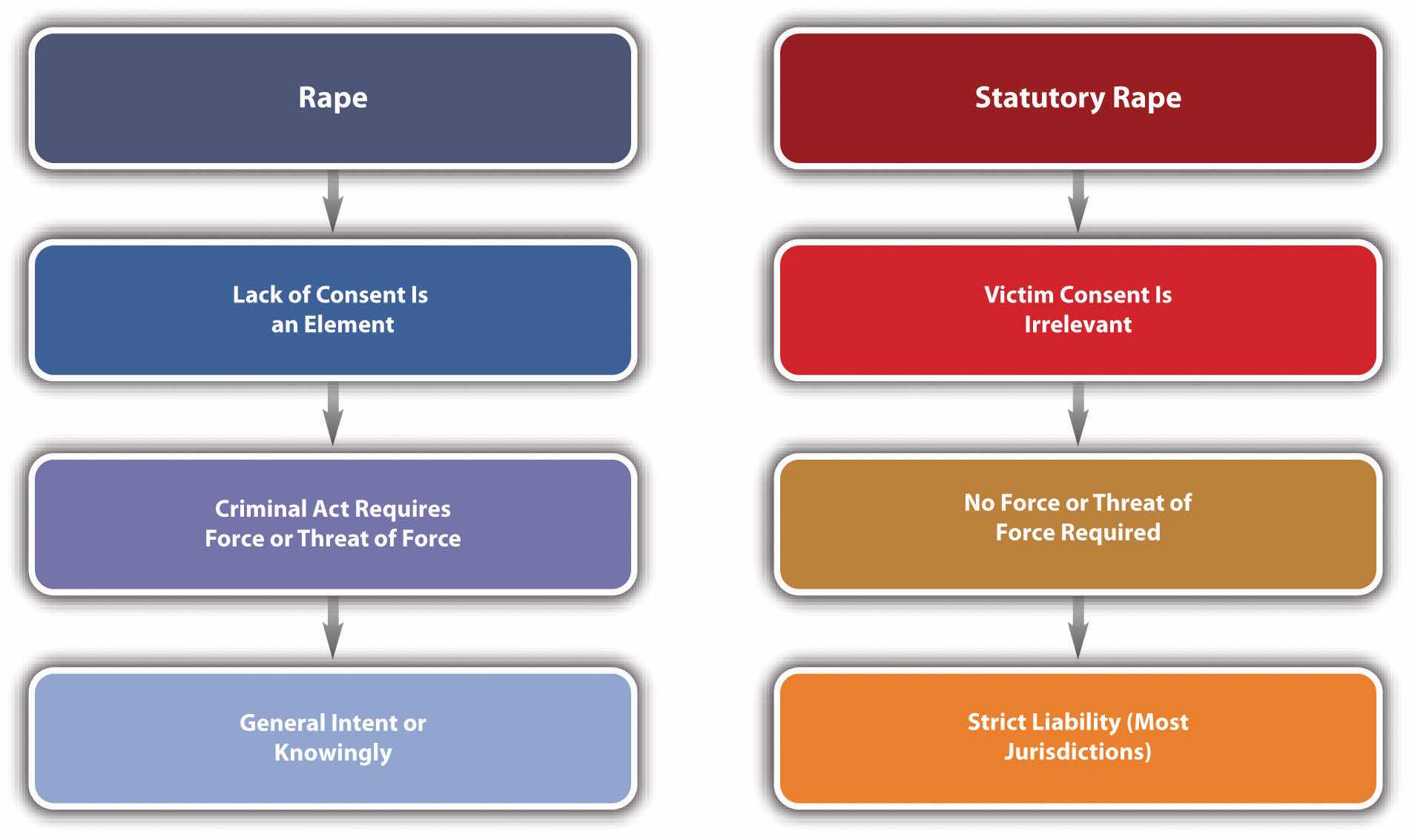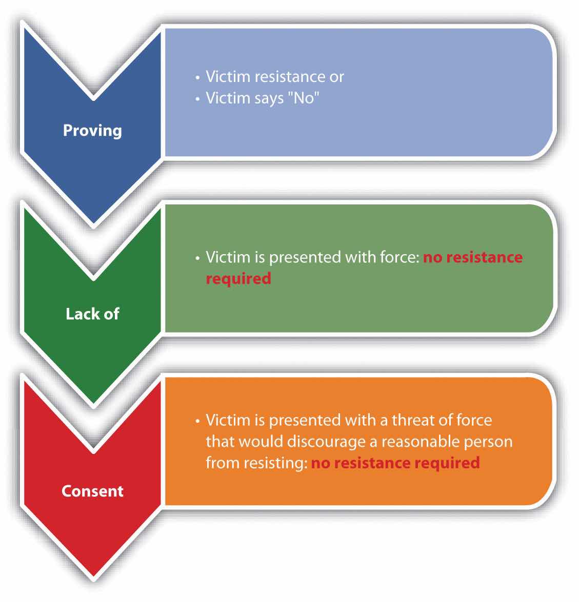| Crime | Criminal Act | Lack of Victim Consent? | Victim Resistance? | Other Differences |