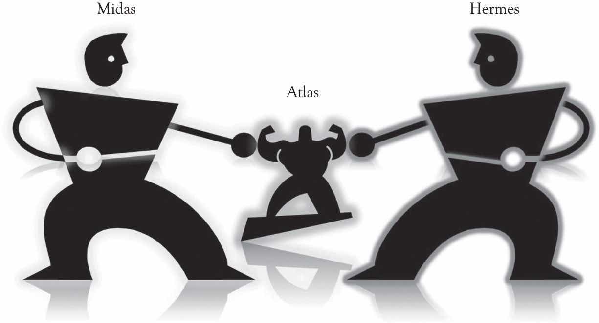 A central theme of this book is that there is, or should be, a constant struggle going on in every organization, business, and system. The struggle is fueled by the dynamic tension that exists between delivering Midas feature-rich versions of products and services using extravagant engineering and delivering low-cost Hermes versions of products and services using frugal engineering (see Figure 1). Midas versions are high-end products for nonprice-sensitive consumers. Hermes versions are for price-sensitive consumers. The results of this dynamic tension between Midas versioning and Hermes versioning are Atlas products and services. Atlas products and services are designed for mainstream consumers. Atlas products and services incorporate the product design features that will attract the broadest customer base and will also be profitable. The driving force behind the development of Midas, Atlas, and Hermes versions is driven by the implicit creative genius that everyone possess and most businesses should possess as they engage in continuous learning-about and learn-by-doing activities.