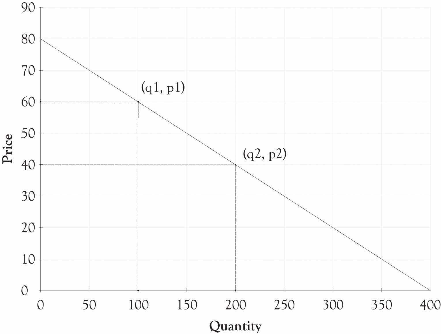 Her first task was to develop a demand equation. The demand equation relates the quantity of the good demanded by consumers to the price of the good. Demand equations are in the form: Price = constant + slope*Quantity. This can be calculated by finding the slope of the curve using any two points (see Figure 3.9 "Two Points Are Used to Derive the Demand Curve"). We will use the points (q1, p1) or (100, $60) and (q2, p2) or (200, $40). The slope is the rise over the run or: