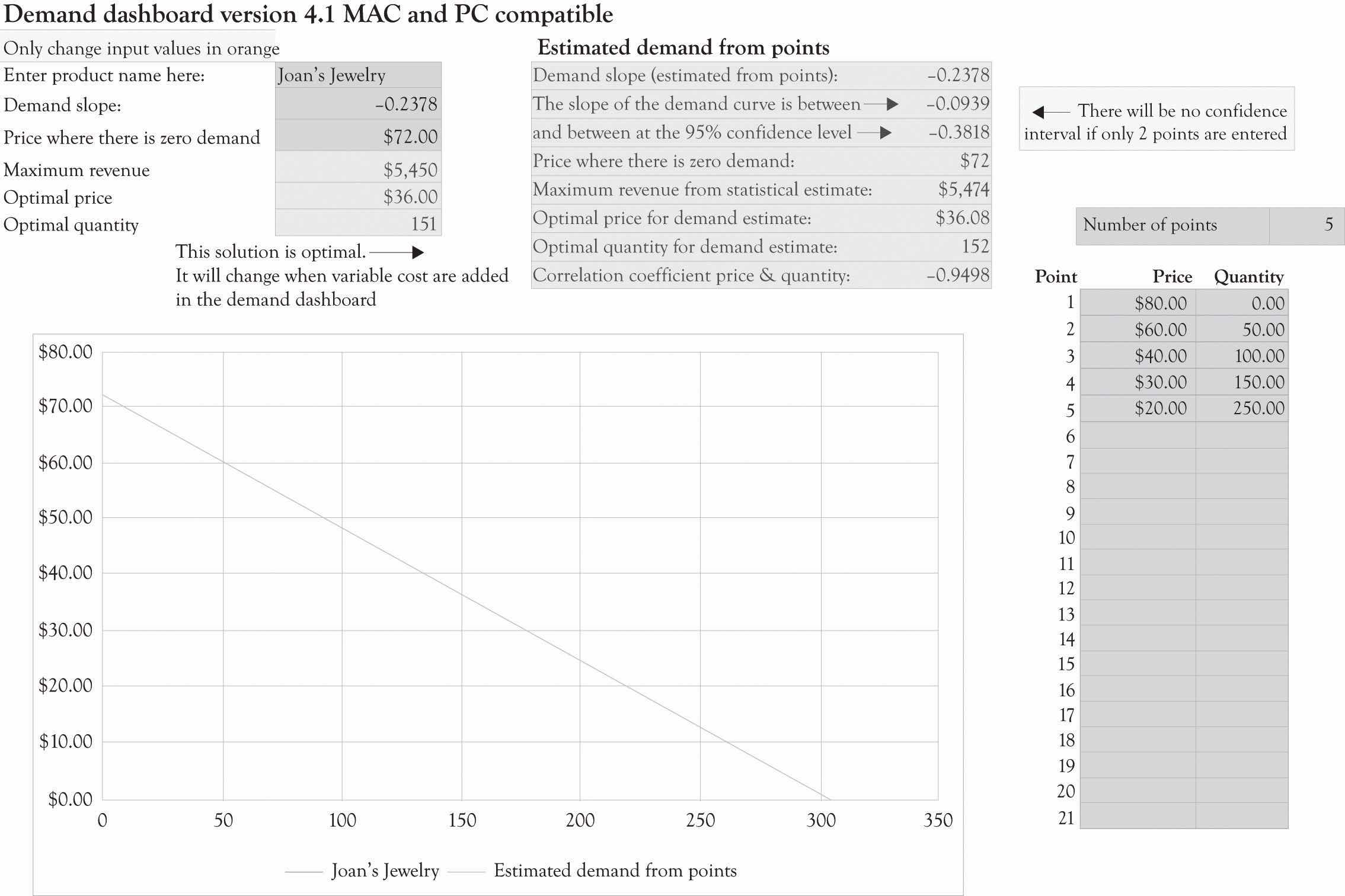 Figure 3.6 "Demand Analysis Dashboard" illustrates the demand spreadsheet for Joan’s jewelry. The demand dashboard spreadsheet is used to calculate the slope and the maximum amount consumers would be willing to pay for a product. Figure 3.7 "Differentiation Dashboard Using Demand Analysis Dashboard Input and Financial Data from Joan" presents a differentiation dashboard spreadsheet. The differentiation dashboardUsed to determine profitability due to product differentiation. Also computes an optimal solution for the demand curve when only one version is offered. is used to determine the profitability due to product differentiation. The differentiation dashboard also computes an optimal solution for the demand curve when only one version is offered. The optimal price would be $47.50 and, at that price, Joan would sell 162.5 jewelry boxes. As you can see from the solution in Figure 3.7 "Differentiation Dashboard Using Demand Analysis Dashboard Input and Financial Data from Joan", the monthly cash flow using the optimal solution yields a monthly profit of $3,281.25, which is still not very close to the monthly net profit of $4,500 with three versions. The value of the business would be $393,750 if we assume a cost-of-capital value of 10% (12 × $3,281.25/0.10). The optimal solution is very helpful for identifying a starting point for selecting a price point for one product and for identifying price points for additional versions. The differentiation dashboard is very useful for conducting sensitivity analysis and what-if analysis for differentiating up to three products and services.