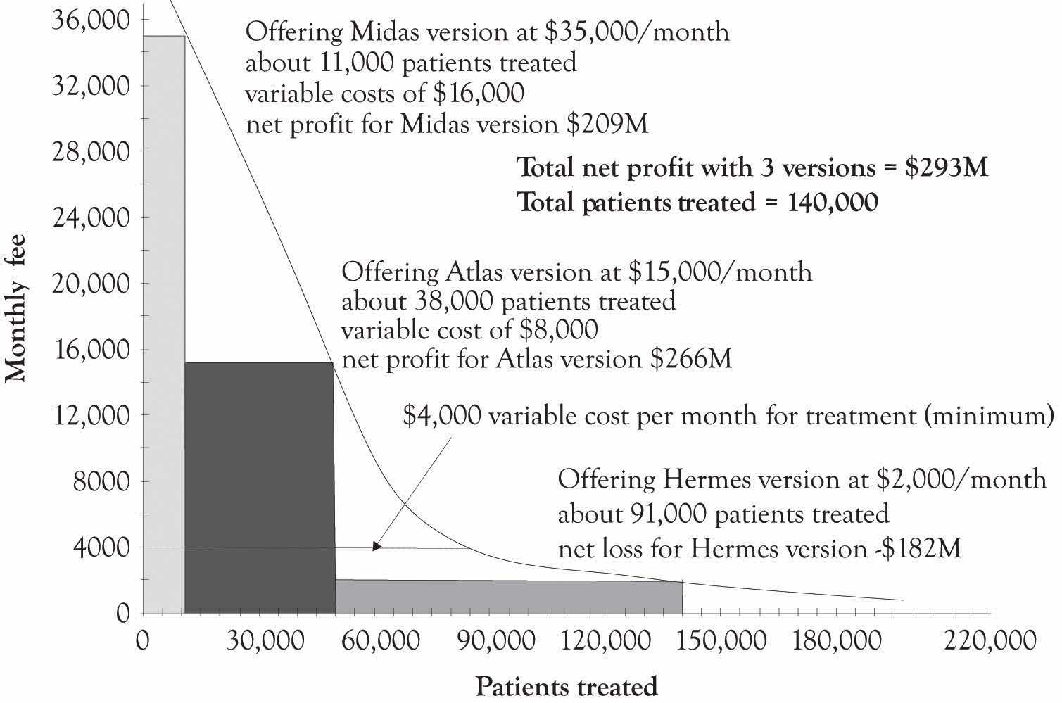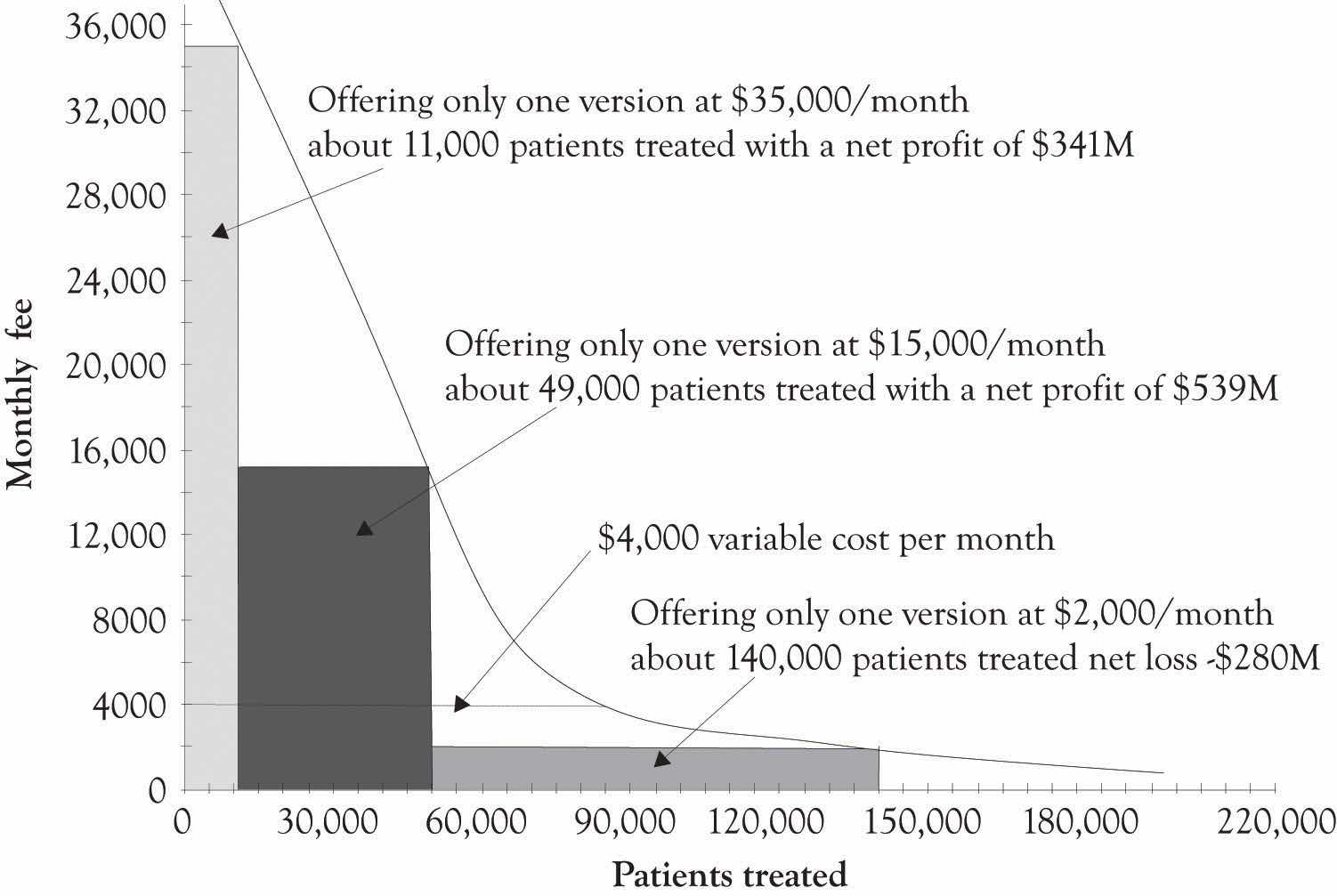 Figure 5.14 "Net Profits When Only One Version of the Treatment Is Offered" illustrates a hypothetical demand curve for a hypothetical treatment for a hypothetical cancer that affects 200,000 individuals a year. The made-up variable costs for treating the cancer were set at $4,000. This is the base or minimum variable cost. As illustrated in Figure 5.14 "Net Profits When Only One Version of the Treatment Is Offered", if the company only sold one version at $35,000 per month, they would net $341 million per month. If they sell only the Atlas version at $15,000 per month, they would net $539 million per month. If they sell the Hermes version at $2,000 per month, they would lose $280 million per month.