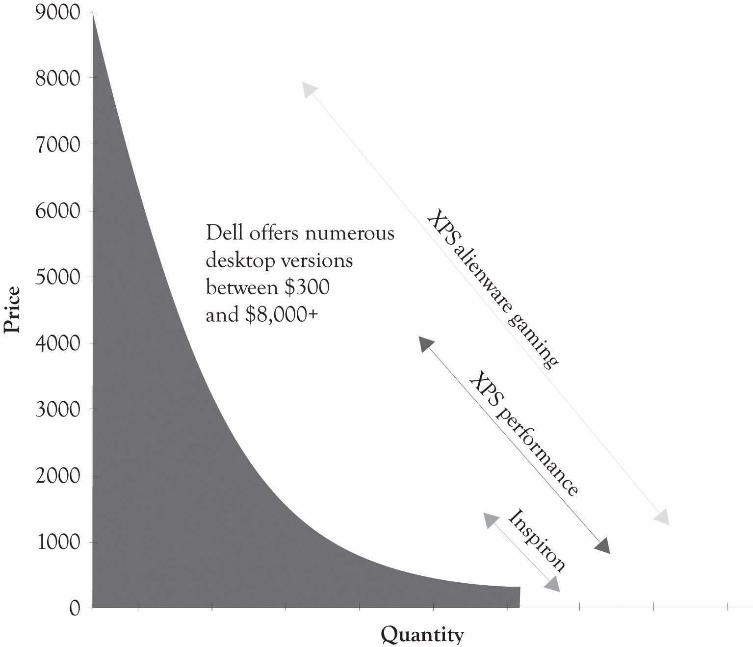 Dell, because of its direct selling and the ability to install numerous features, is a prime example of dynamic differentiation. They offer literally thousands of different product configurations or versions. As illustrated in Figure 5.5 "Differentiation at Dell", Dell has feature points over a broad range of prices (these statistics approximate Dell’s line in 2011).
