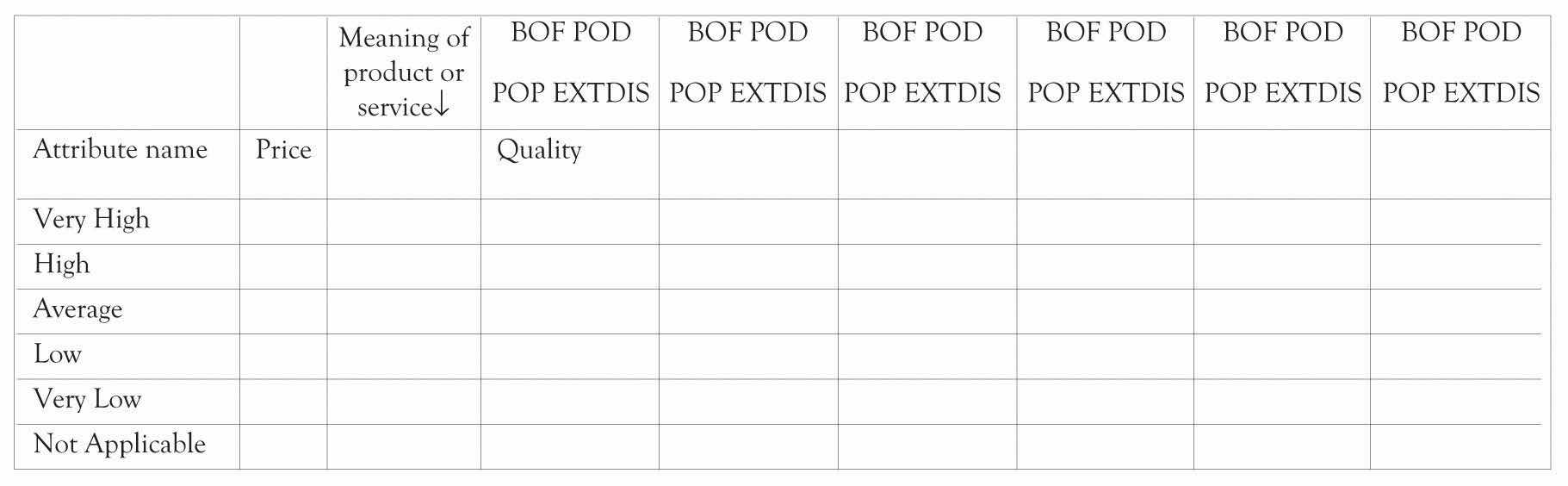 Some attributes of products were important 5 years ago, but they are not today. Some product features were not even available last year, but they are mandatory today. Similarly, product designs and their accompanying meanings are constantly in flux. The importance of product attributes changes. The following classification scheme can be used to ascertain whether attributes and features are increasing or declining in importance. The classification scheme was derived from a variety of sources.Iyer and Muncy (2005); Keller, Sternthal, and Tybout (2002); Keller and Tybout (2002); Kim and Mauborgne (2005); McGrath and MacMillan (2000); Tybout and Sternthal (2005).