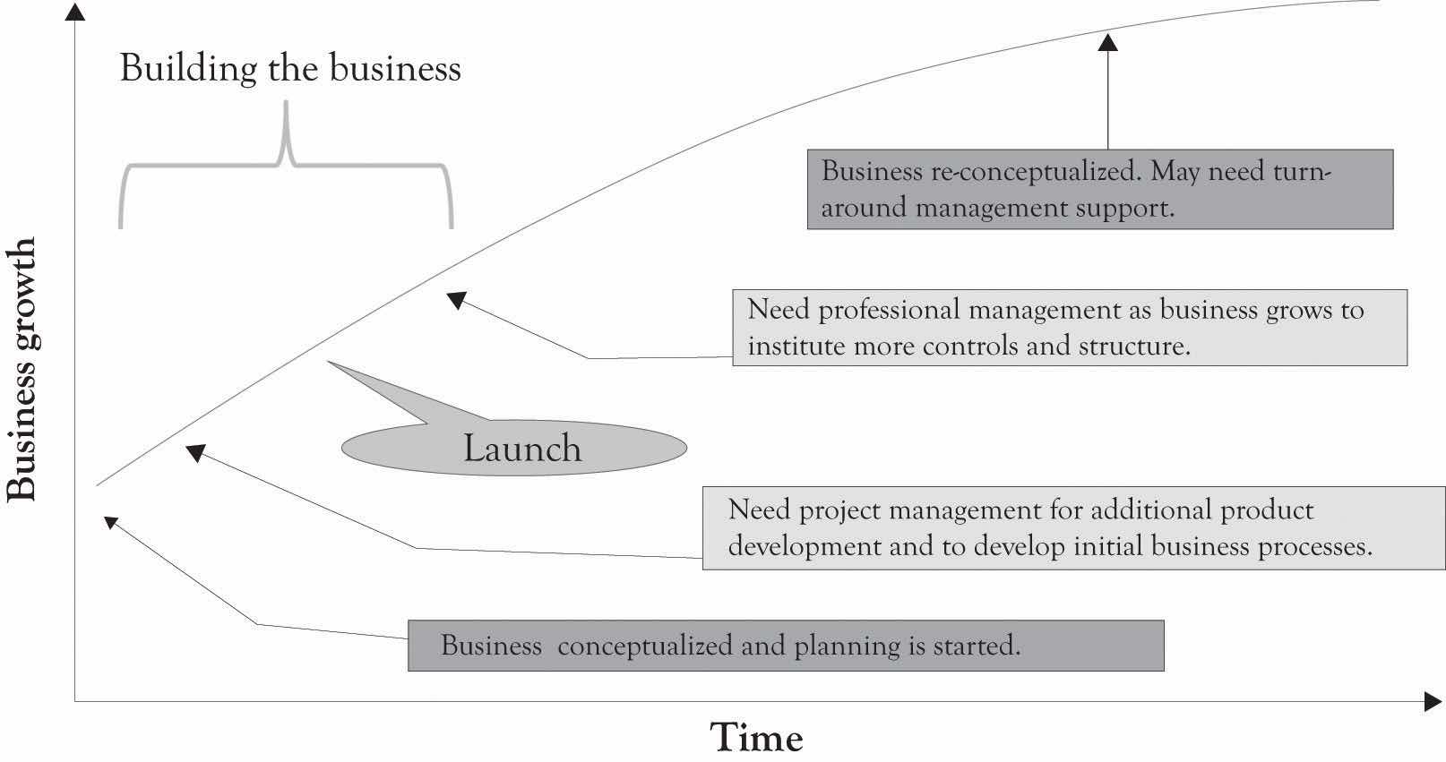 Project managementThe tool for executing the plan and installing the business processes. is the tool for executing the plan and installing the business processes. It helps to detail what tasks will be accomplished, who will be involved in completing the tasks, and when tasks should start and finish. The minimal tasks that need to be accomplished for a business to start or launch include marketing and sales, production and operations, staffing, and accounting. In addition, some sort of research and development (R&D) process needs to be initiated soon after launch in order to re-prime the pump. These are the first steps in designing organizations for the long term.