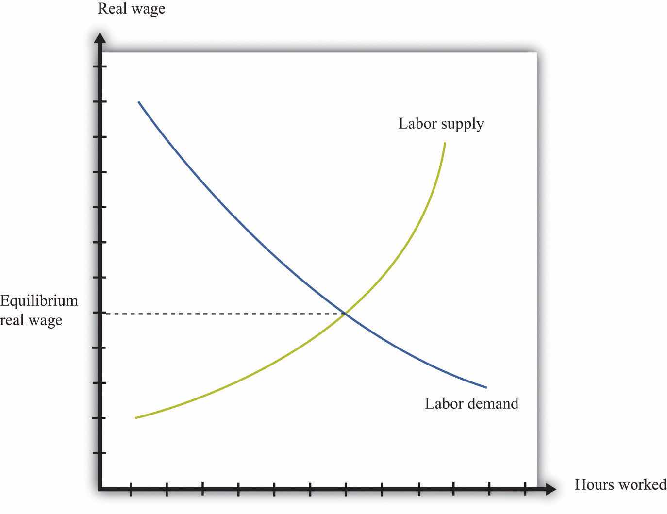 When economists are asked to explain the creation and destruction of jobs in an economy, they will typically begin with a diagram of supply and demand in the labor market. In the labor market, the real wage (on the vertical axis) and the total number of hours worked (on the horizontal axis) are determined by the interaction of labor supply and labor demand. As shown in Figure 9.4 "Labor Market Equilibrium", equilibrium in the labor market occurs at the wage and employment level such that the number of hours supplied and demanded is equal.