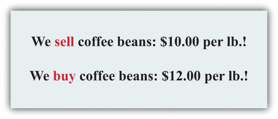 Imagine you passed a coffee shop and saw the sign shown in Figure 10.4 "Arbitrage at a Coffee Shop". This would make an economist salivate, not because of the prospect of good coffee but because it presents an opportunity for arbitrage. Facing an offer like this, you could immediately go and buy a pound of coffee beans for $10. Then you could turn around and sell the coffee at $12 per pound. You would have made $2 easy profit. Forget about drinking the coffee: just buy and sell, buy and sell, pound after pound—and become a billionaire. This is an example of arbitrage.