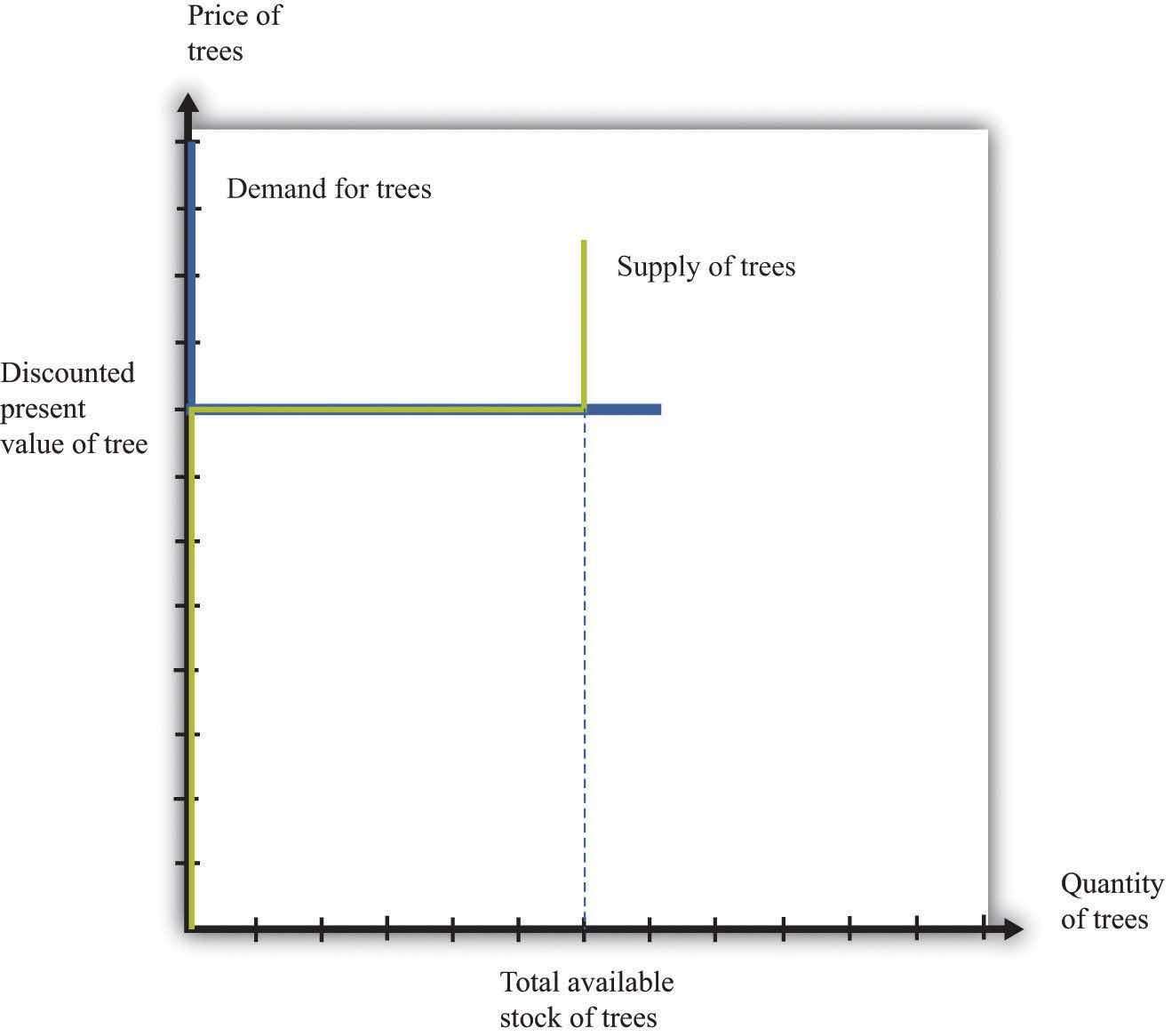 Because buyers and sellers place the same value on the tree, the demand and supply curves lie on top of each other at this value, so the price will equal the discounted present value of the tree.