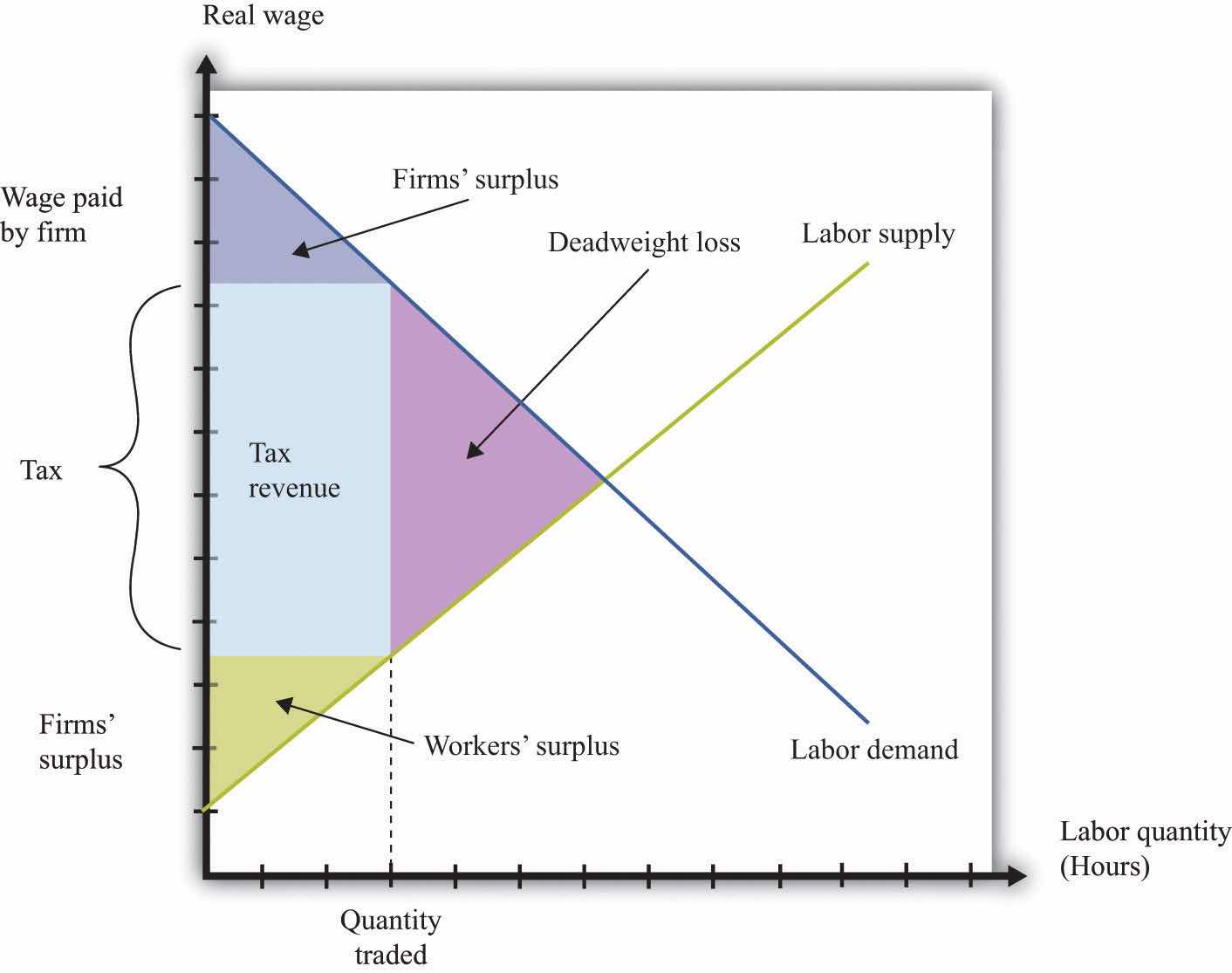 Governments also affect the labor market through the imposition of taxes. In most countries, there is an income tax. In some cases, income taxes may also be imposed more locally: some individual states within the United States have an income tax in addition to the federal tax. An income tax works like the taxes we saw earlier. Fundamentally, it means that the amount paid by the employer exceeds the amount received by the worker. Exactly as before, this gives rise to a deadweight loss. Some workers will choose not to work or work fewer hours because of the tax. It follows that some mutually beneficial transactions go unrealized.